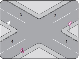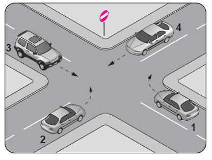 31. Şekildeki gibi kontrolsüz kavşakta karşılaşan araçların geçiş hakkı sıralaması nasıl olmalıdır?